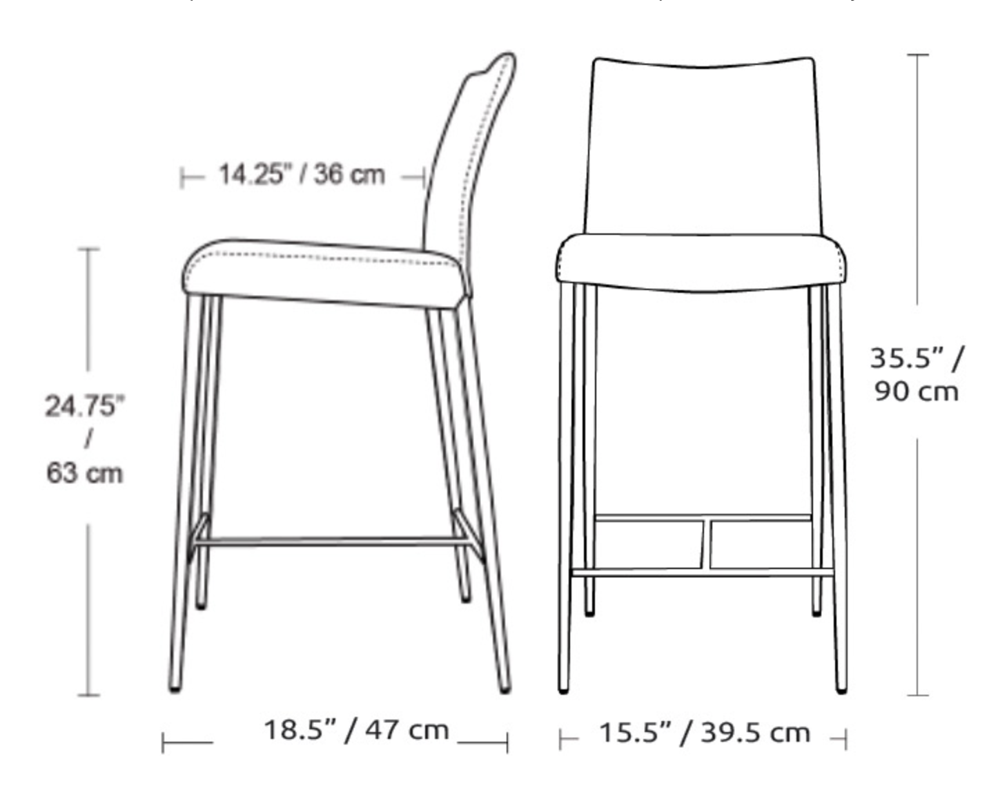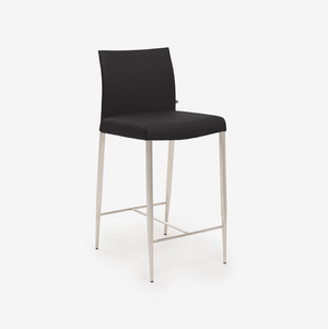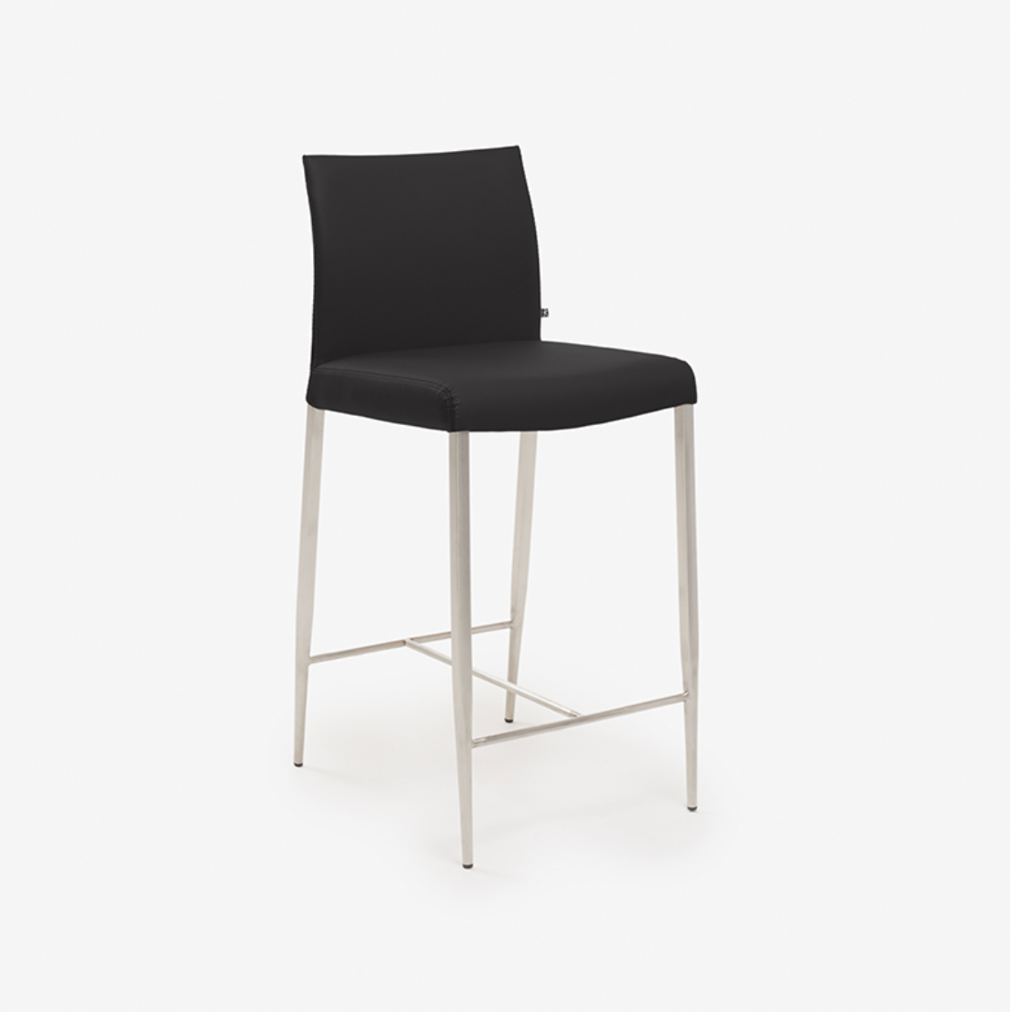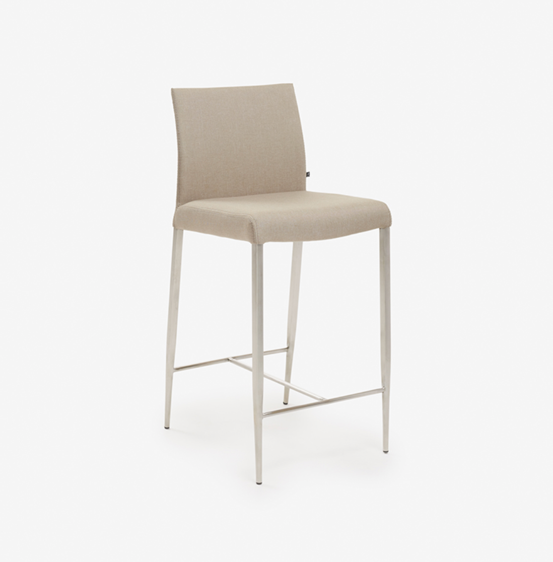 Tabouret structure d’acier à dossier bas avec pattes en acier inoxydable brossé.